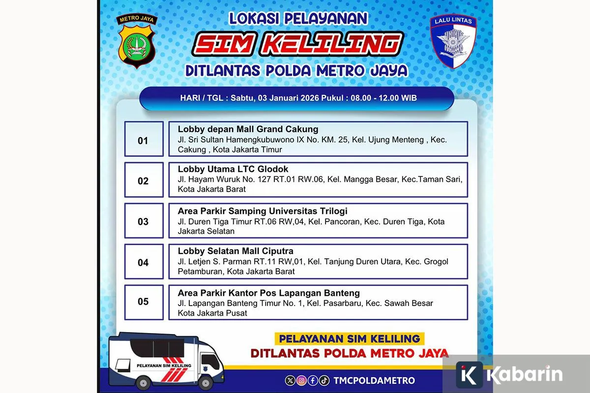 Melalui akun X (Twitter) resmi TMC Polda Metro Jaya, diinformasikan, layanan tersebut berada di :