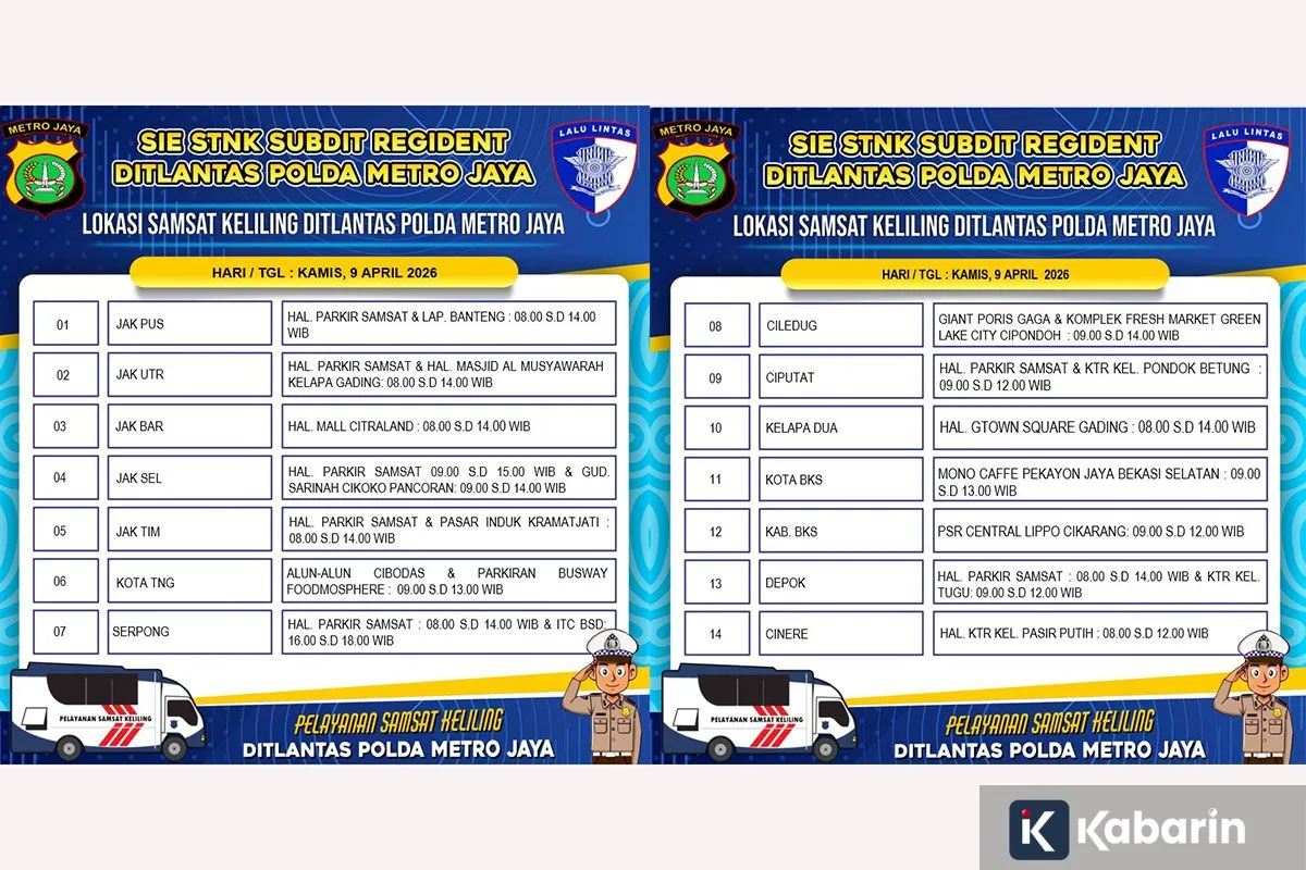Menurut akun Instagram resmi TMC Polda Metro Jaya, 14 wilayah Jadetabek yang menyediakan layanan Samsat itu adalah