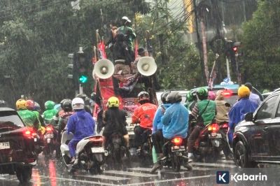 Hujan deras tak gentarkan driver ojol untuk tetap unjuk rasa di DPR